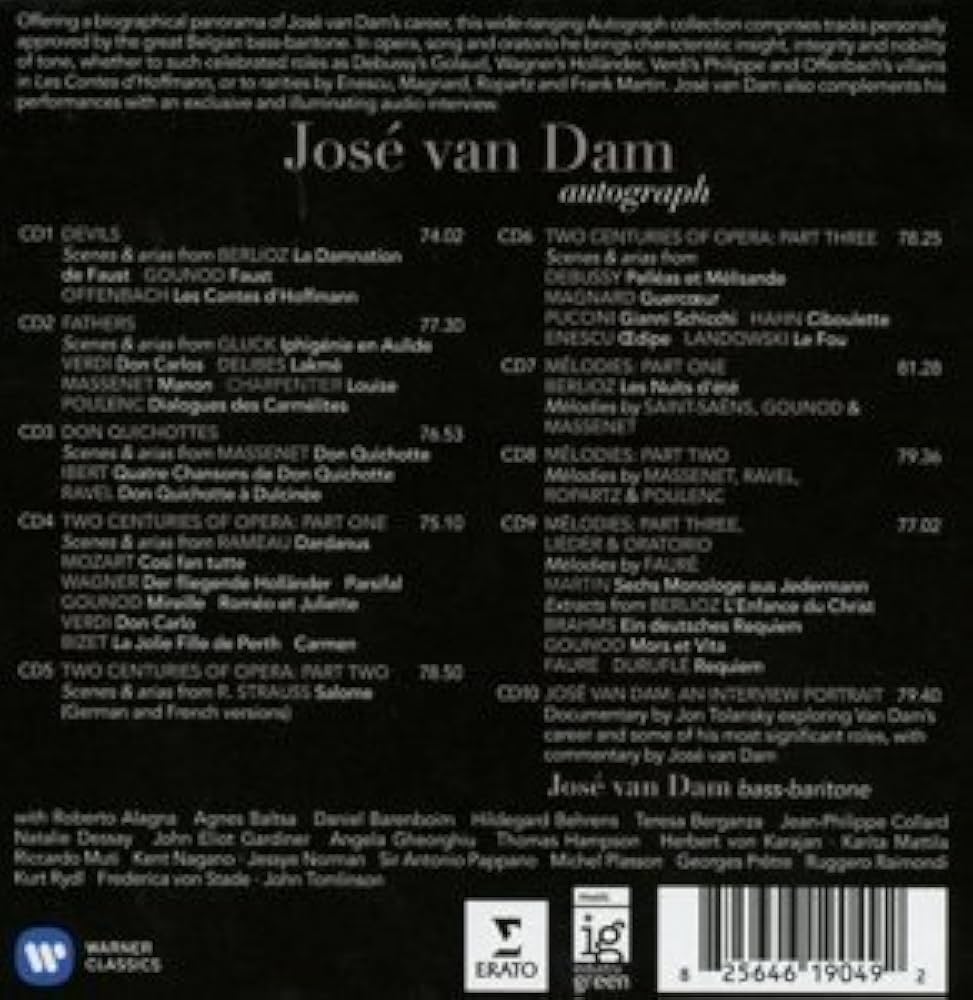C’est à l’évidence l’un des portraits les plus fidèles de l’art et de la carrière du baryton disparu, avec plusieurs raretés, notamment les magnifiques Monologues de Jedermann de Frank Martin, de larges extraits des deux enregistrements de Salomé auxquels José Van Dam a participé, celui très célèbre de Karajan, et l’autre beaucoup moins de Kent Nagano à l’opéra de Lyon.. dans la version française de l’opéra de Richard Strauss. De la même manière José Van Dam est magnifique dans le Don Carlo (Karajan) comme dans le Don Carlos de Verdi (Pappano). Un joli bouquet de mélodies de Saint-Saëns, Ravel, Poulenc, Ropartz et Berlioz (Les nuits d’été notamment avec Jean-Philippe Collard)