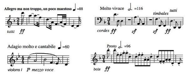 La tonalité de ré mineur est la signature de sa 9e et dernière symphonie (même si le finale célébrissime de l’oeuvre, l’Ode à la joie, se clôt par un triomphal ré majeur) : ci-dessous les premières notes du début de chaque mouvement de la 9e.