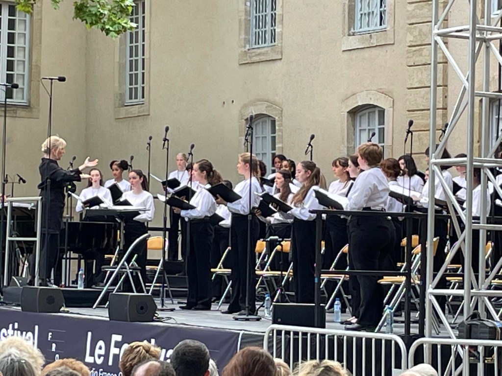 Sur le parvis du château d’O, la Maîtrise de Radio France sous la conduite de sa cheffe Sofi Jeannin.