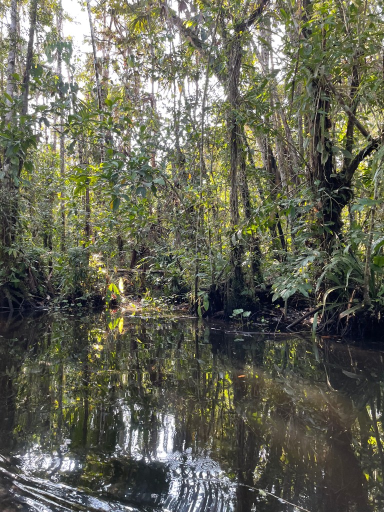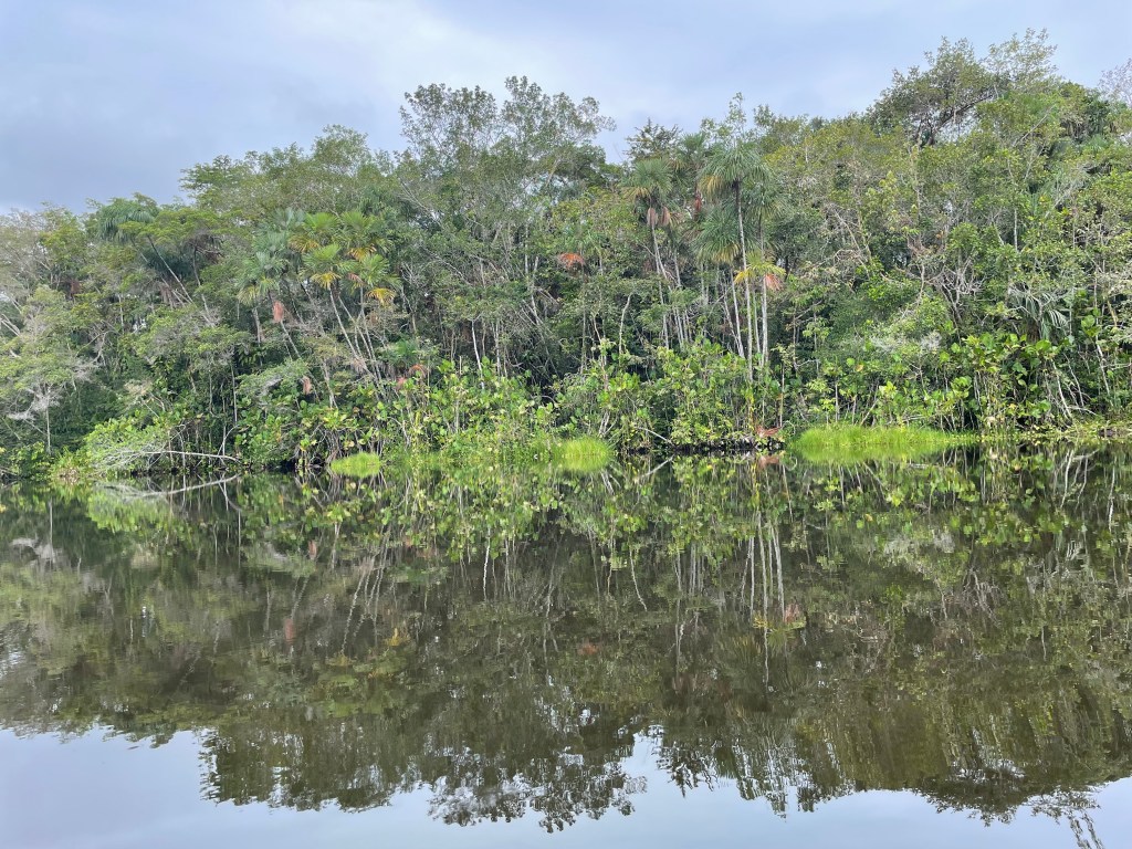 L’immensité du silence seulement troublé par le vol de quelques aras bavards, le bateau qui avance sur une eau sombre au milieu d’une végétation luxuriante, avant de déboucher sur une sorte de lac et d’apercevoir une première habitation en bois.