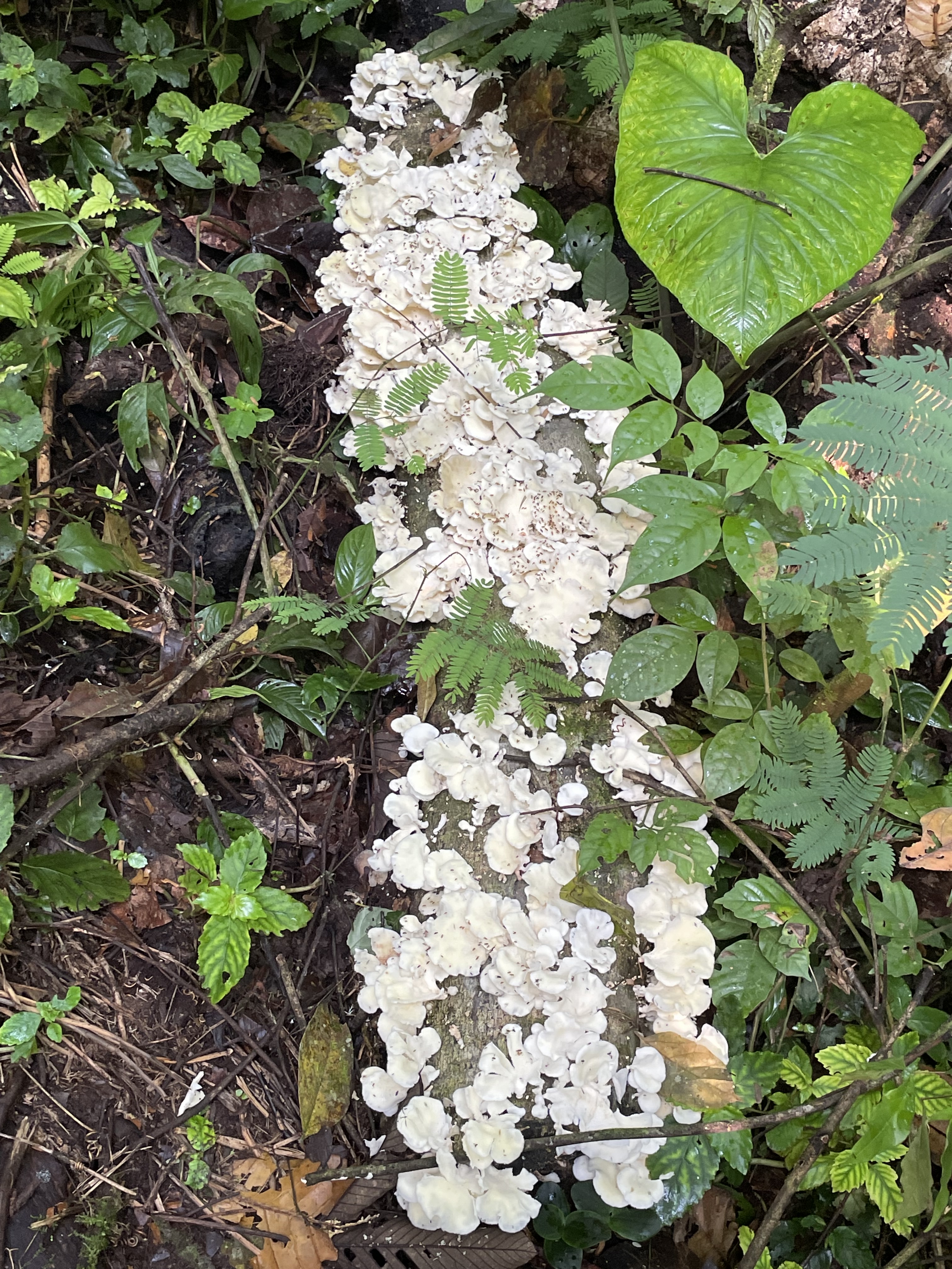 Ces champignons blancs sont dotés d’admirables vertus : ils attirent tous les moustiques du coin – on ne les voit pas sur la photo, mais ils étaient bien plusieurs centaines ! – ils soignent les problèmes digestifs, ont un effet cautérisant sur les brûlures de la peau, etc.