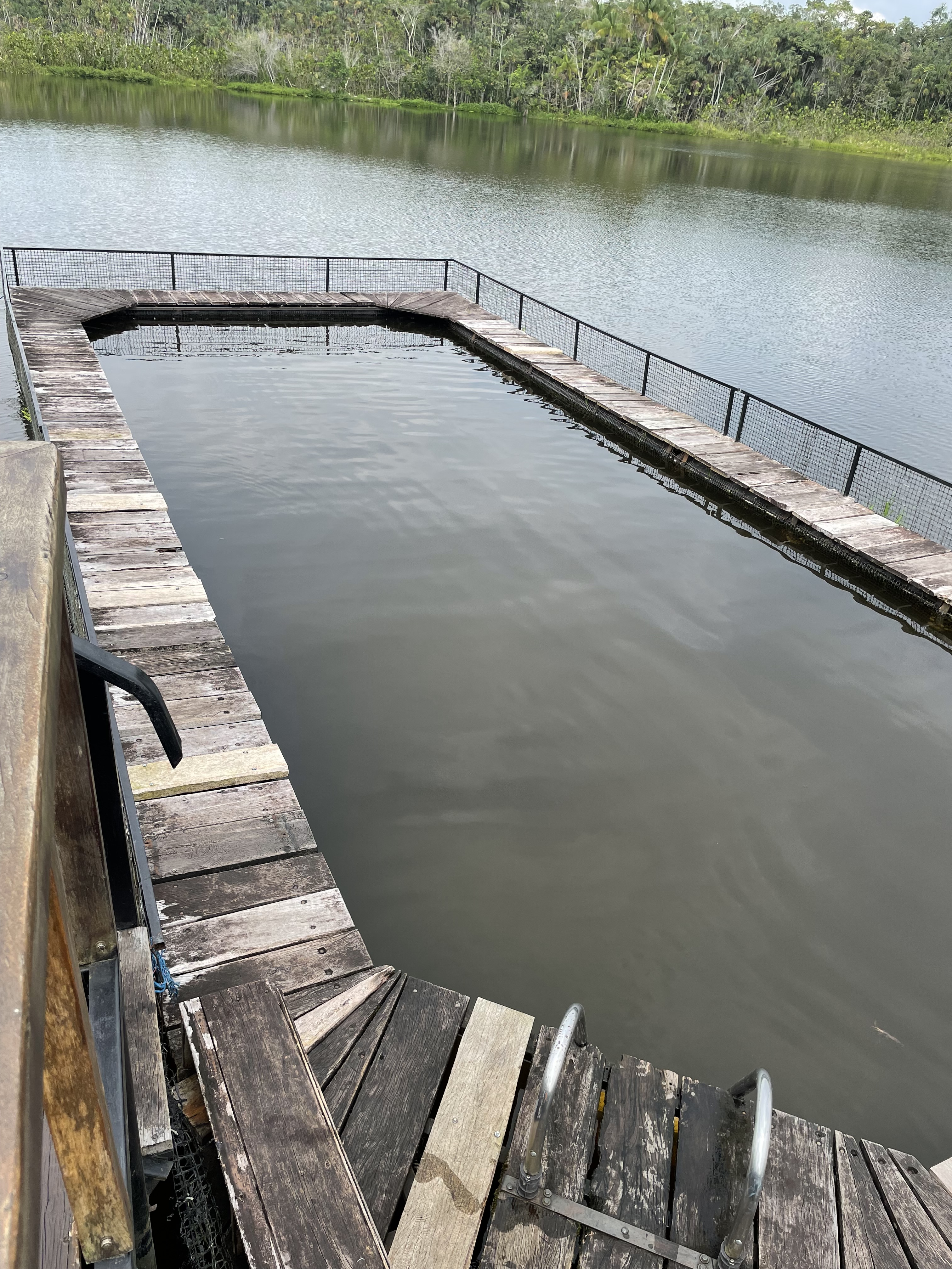 Il paraît qu’ils ne sont pas dangereux… Voire ! On est plutôt rassuré de pouvoir se baigner dans l’eau sombre du lac, dans une piscine-cage, séparés des loutres, poissons, et autres bestioles qui peuplent les lieux !