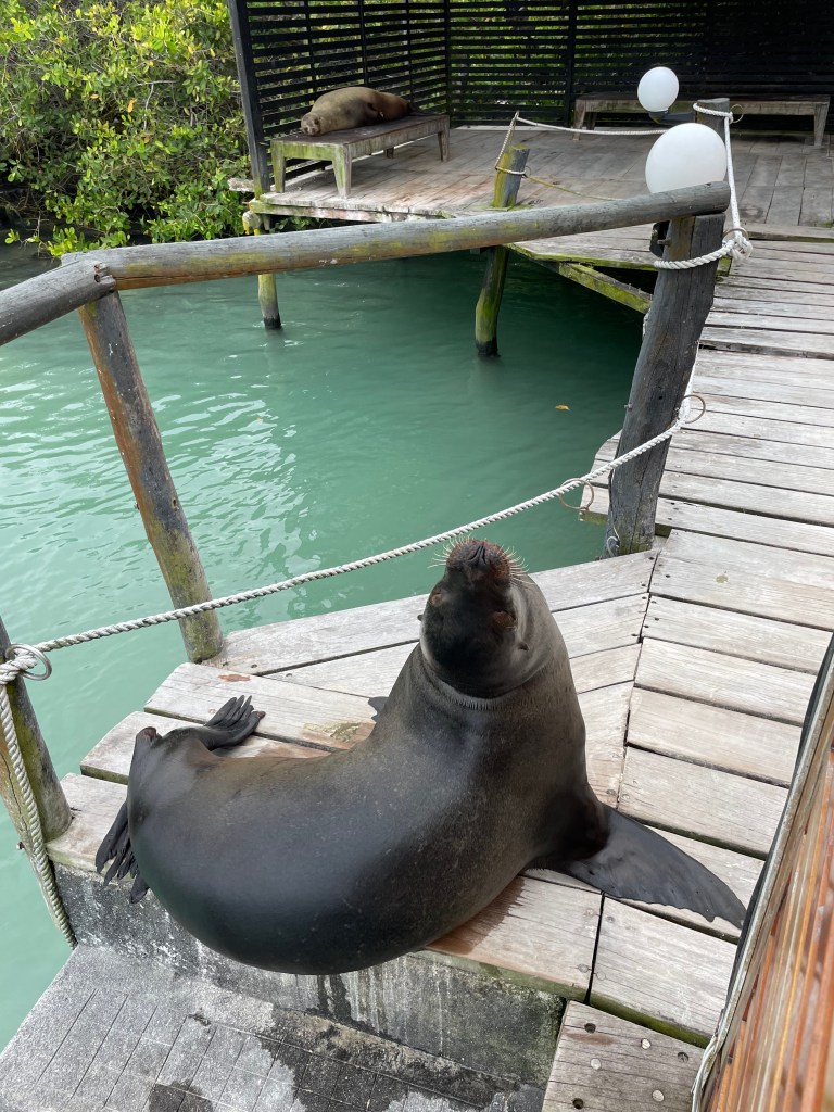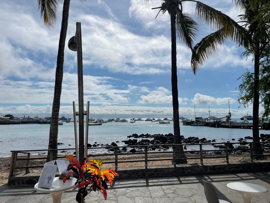 Arrivée ensuite à Puerto Ayora, la ville la plus importante de l’archipel, 9000 âmes.Rien de transcendant de prime abord. On va apprendre à apprécier la quiétude d’une jolie rue principale – la Darwin avenue (toutes les rues principales de l’archipel portent le nom du naturaliste anglais – et une jolie chambre qui surplombe la mer et la terrasse en bois où les phoques viennent se prélasser.