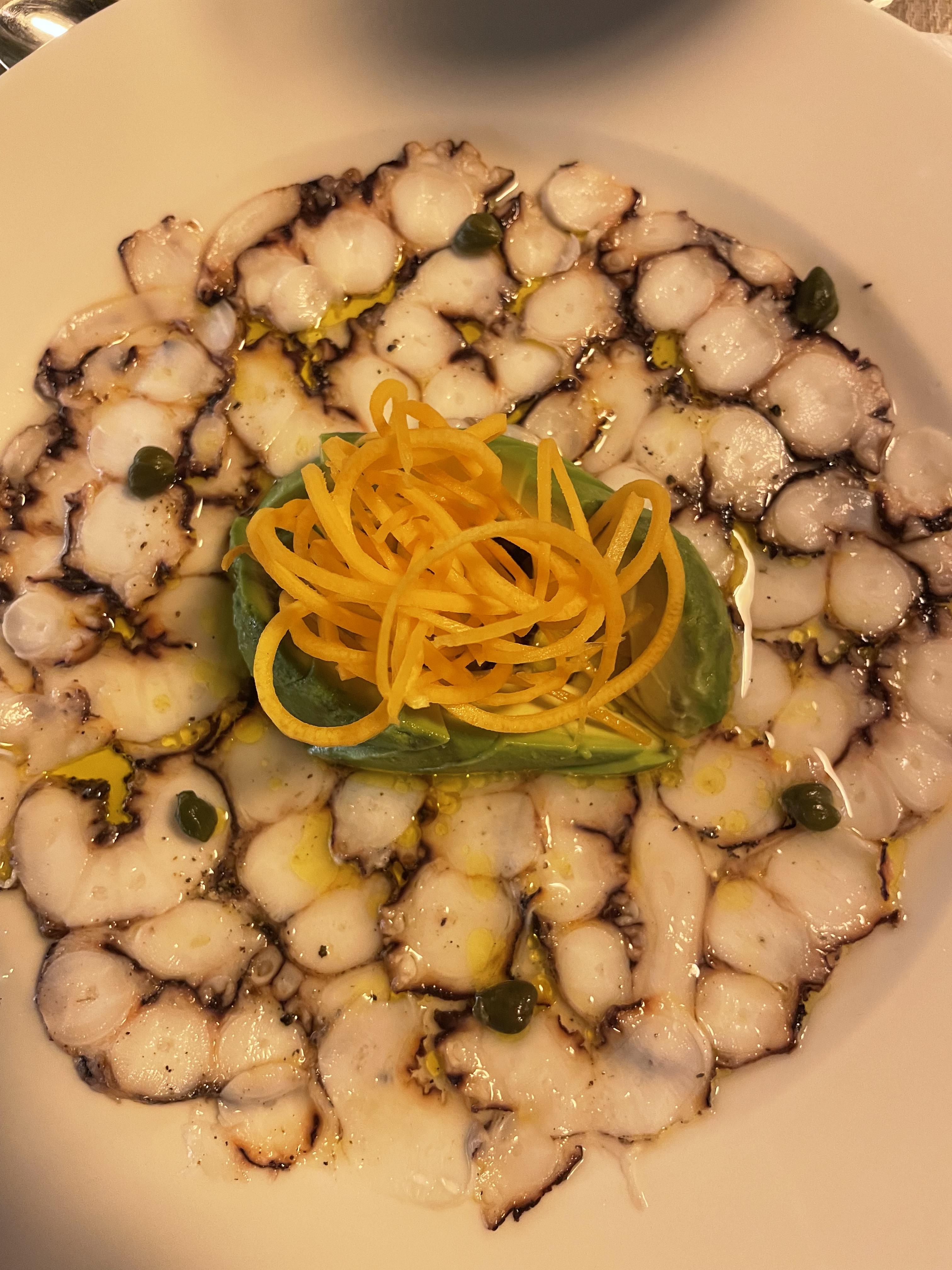 (Carpaccio de poulpe à l’huile parfumée au jus de mangue)
