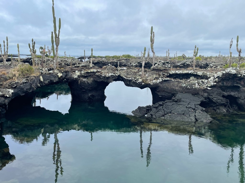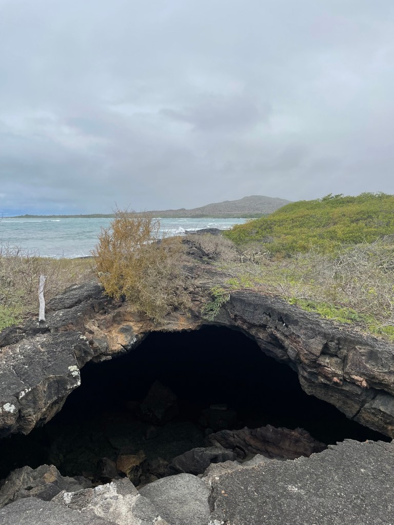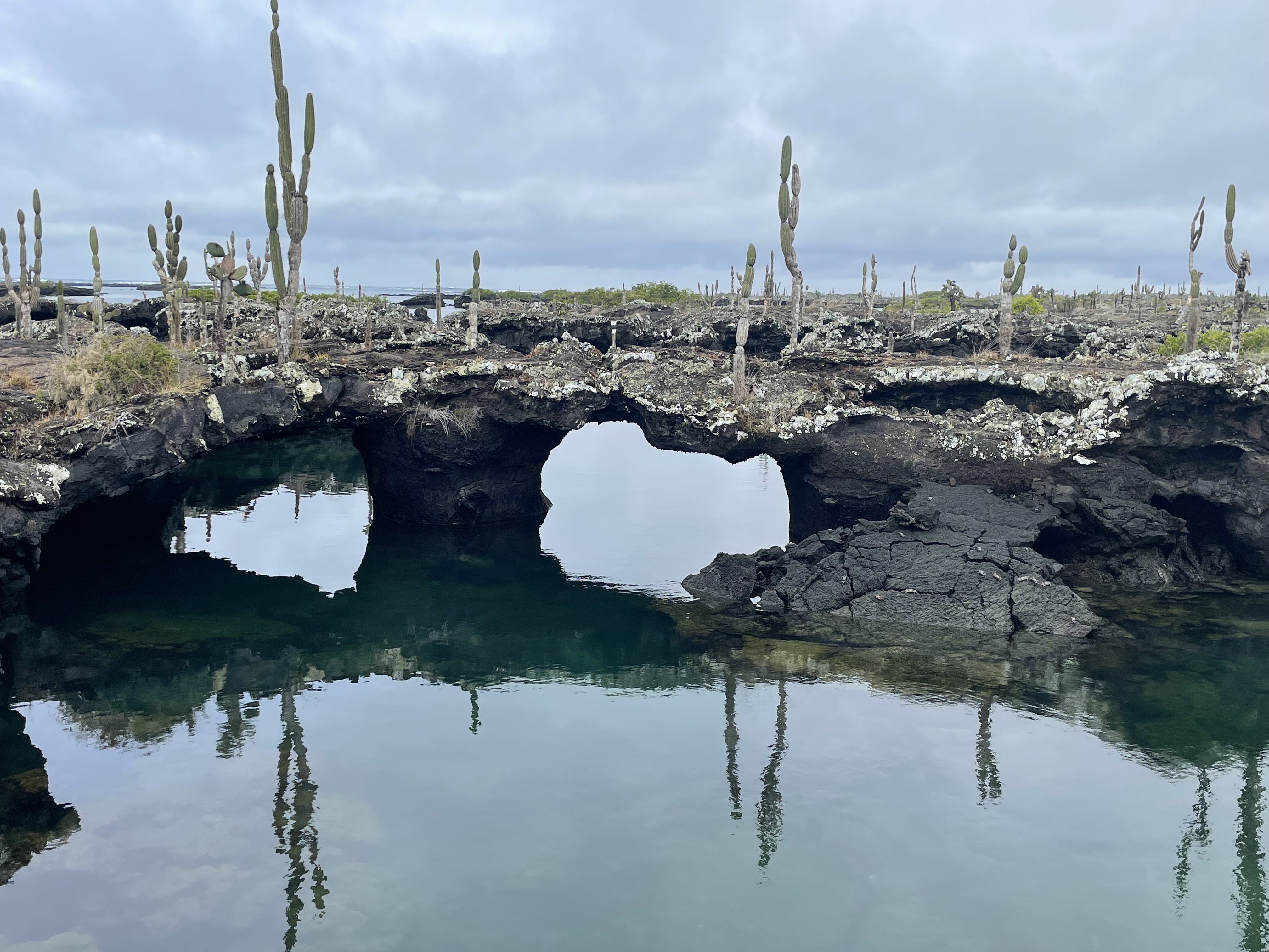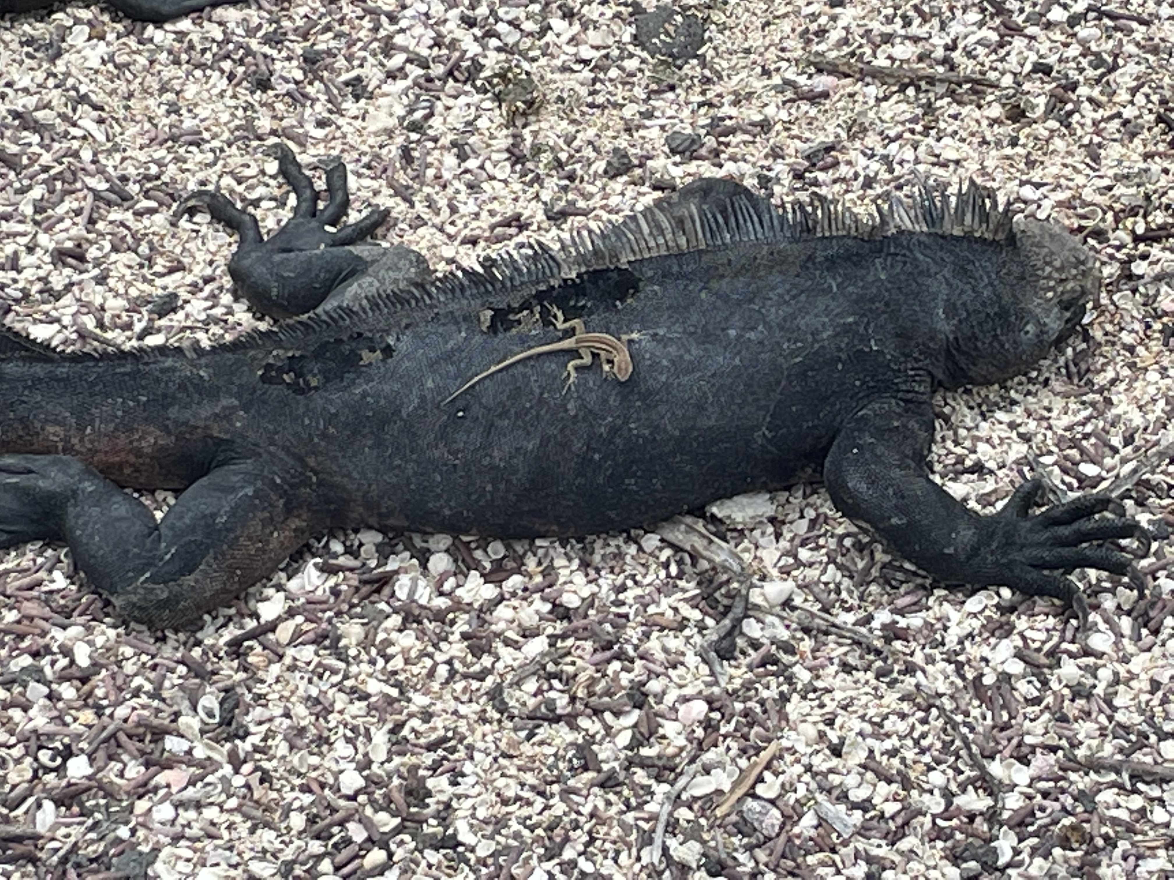 La végétation change du tout au tout qu’on regarde vers l’ouest (comme ici) ou l’est.Au retour on longe une lagune d’eau saumâtre.Un tunnel de lave jusqu’à la mer.Encore des iguanes… Quoi de plus doux que de lézarder sur le dos d’un iguane !Nuit de pleine lune aux Galapagos !