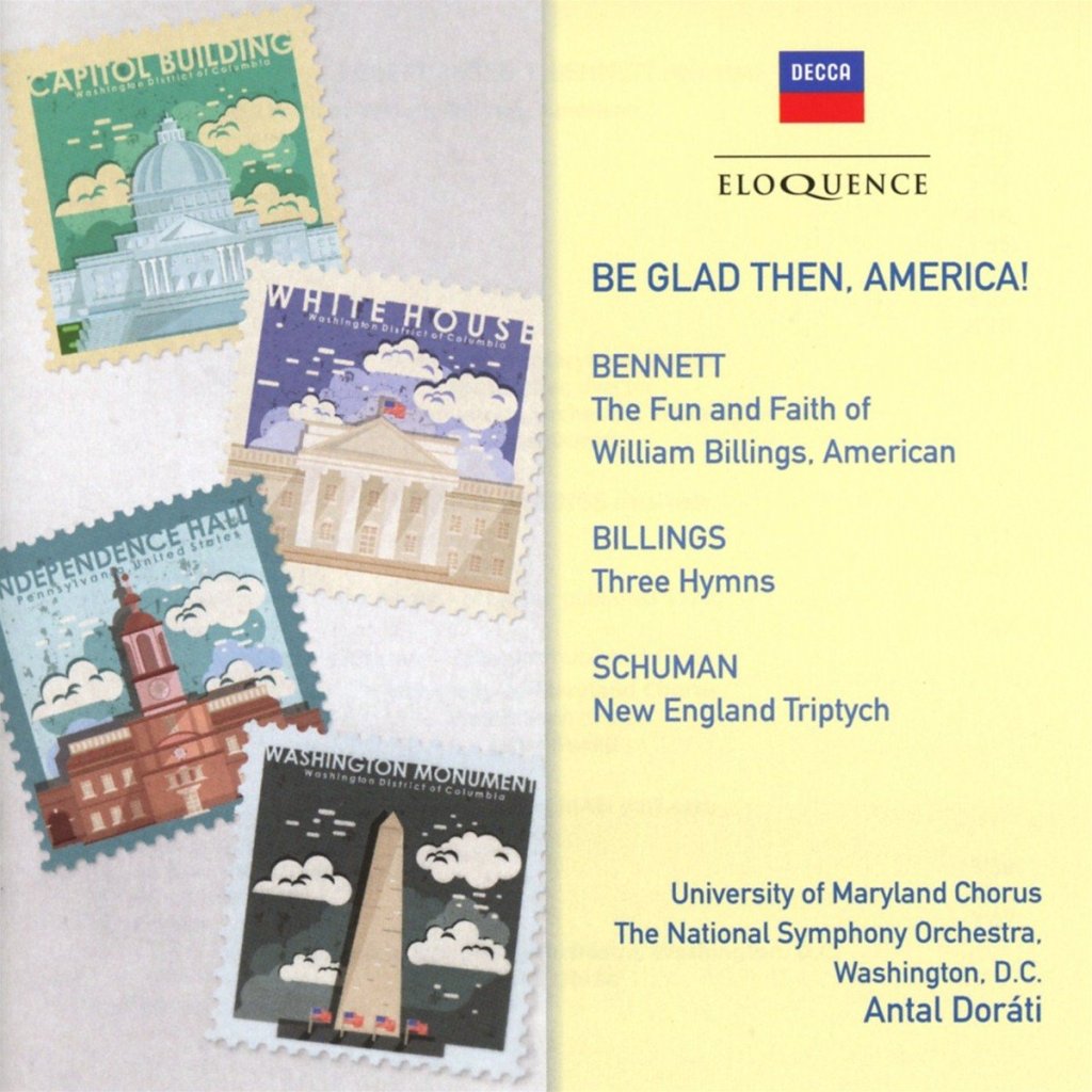 Dans le prolongement de l’élection présidentielle américaine, cette absolue rareté dans la discographie pourtant très abondante d’Antal Dorati, un disque intitulé « Be Glad then America! » et cette oeuvre de Robert Russell Bennett (1894-1981), une commande de l’orchestre National de Washington pour le bicentenaire de l’Indépendance en 1976 : « The fun and faith of William Billings, American ».William Billings (1746-1800) est considéré comme le père de la musique chorale américaine