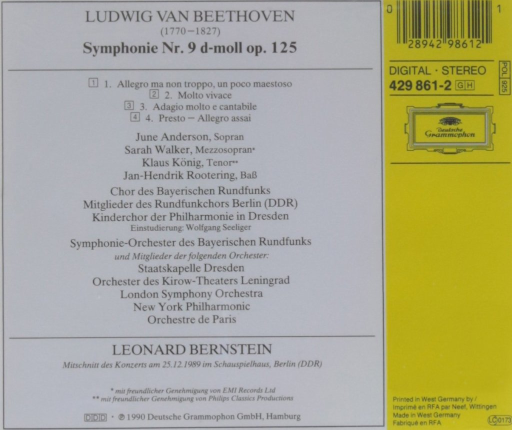 Le 9 novembre 1989 le mur érigé en 1961 entre Berlin Ouest et Berlin Est cédait sous la ferveur populaire.Le 25 décembre, dans la superbe salle du Konzerthaus (à l’époque à Berlin-Est), Leonard Bernstein – qui allait mourir dix mois plus tard – dirigeait la Neuvième symphonie de Beethoven, dont le finale était rebaptisé « Ode an die Freiheit » (Ode à la liberté). Ce concert réunissait autour de l’orchestre de la Radio bavaroise des musiciens des orchestres de Paris, Dresde, Londres, New York et Leningrad (Kirov), les choeurs de la radio bavaroise, de la radio de Berlin-Est et le choeur d’enfants de Dresde, ainsi que quatre solistes June Anderson (USA), Sarah Walker (Grande-Bretagne), Klaus König (RDA) et Jan-Hendrik Rootering (Pays-Bas)