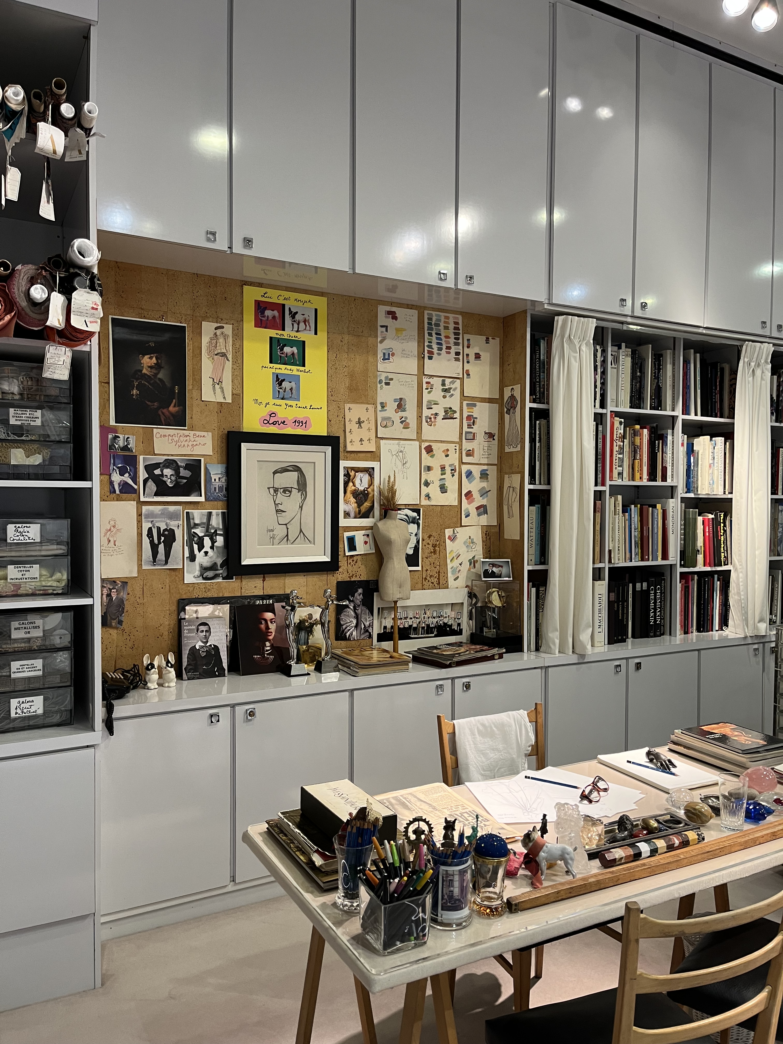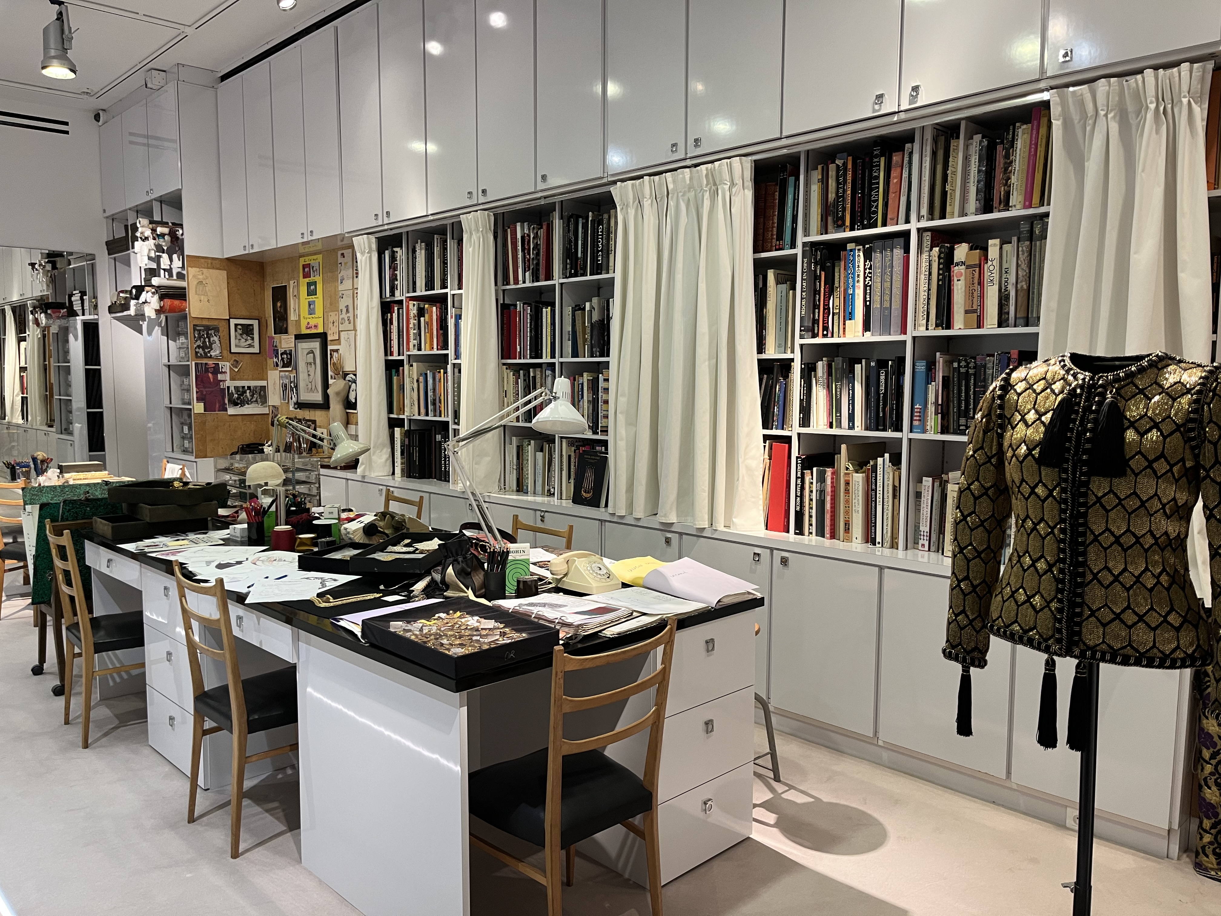 Outre les nombreux modèles exposés, les photos, documents, lettres, dessins, on a la chance de pénétrer dans ce qui fut le mythique « studio » du couturier, reconstitué en l’état.