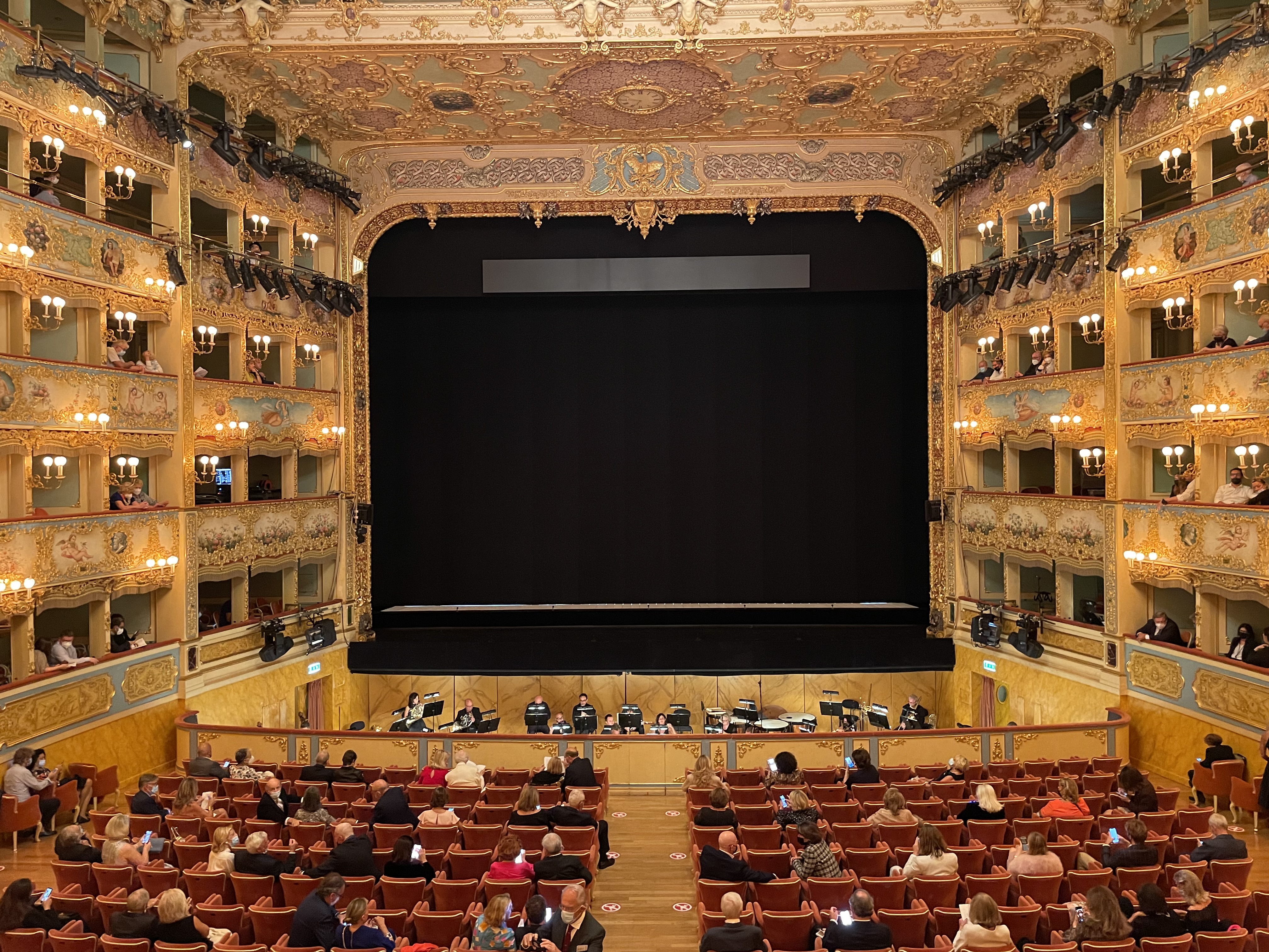 Contrôle du passe sanitaire (ou « vert » en Italie) à l’entrée, port du masque, et malgré cela une salle à demi-vide – une rangée sur deux, et des sièges espacés. Sensation étrange au moment des applaudissements.