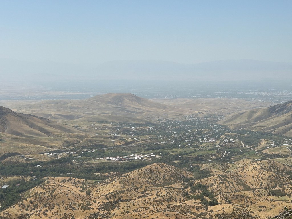 Ce n’était pas prévu au programme, mais la visite s’imposait : la ville natale de Tamerlan, Chakhrisabz, est à une centaine de kilomètres au sud de Samarcande, sur la route de l’Afghanistan. On franchit un col à 1650 m d’altitude au milieu d’un paysage de montagnes nettement plus sec que ceux qu’on a pu traverser au Kirghizistan.