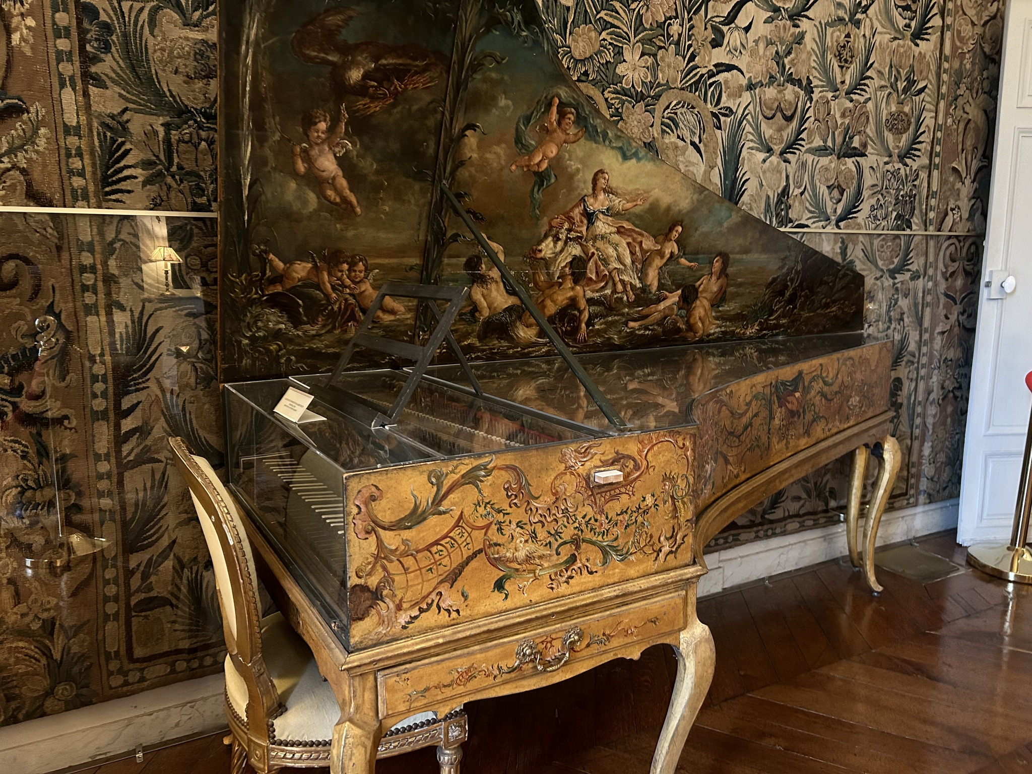 On n’est pas surpris que la musique y ait une place de choix, surtout en découvrant ce fameux portrait par Jacques-Emile Blanche du Groupe des Six : tout en bas à gauche Germaine Tailleferre, au-dessus à gauche, de face Darius Milhaud, de profil Arthur Honegger, au fond avec des lunettes le pianiste Jean Wiener, au centre la pianiste Marcelle Meyer, à sa droite debout Francis Poulenc et Jean Cocteau, assis Georges Auric. Manque Louis Durey.