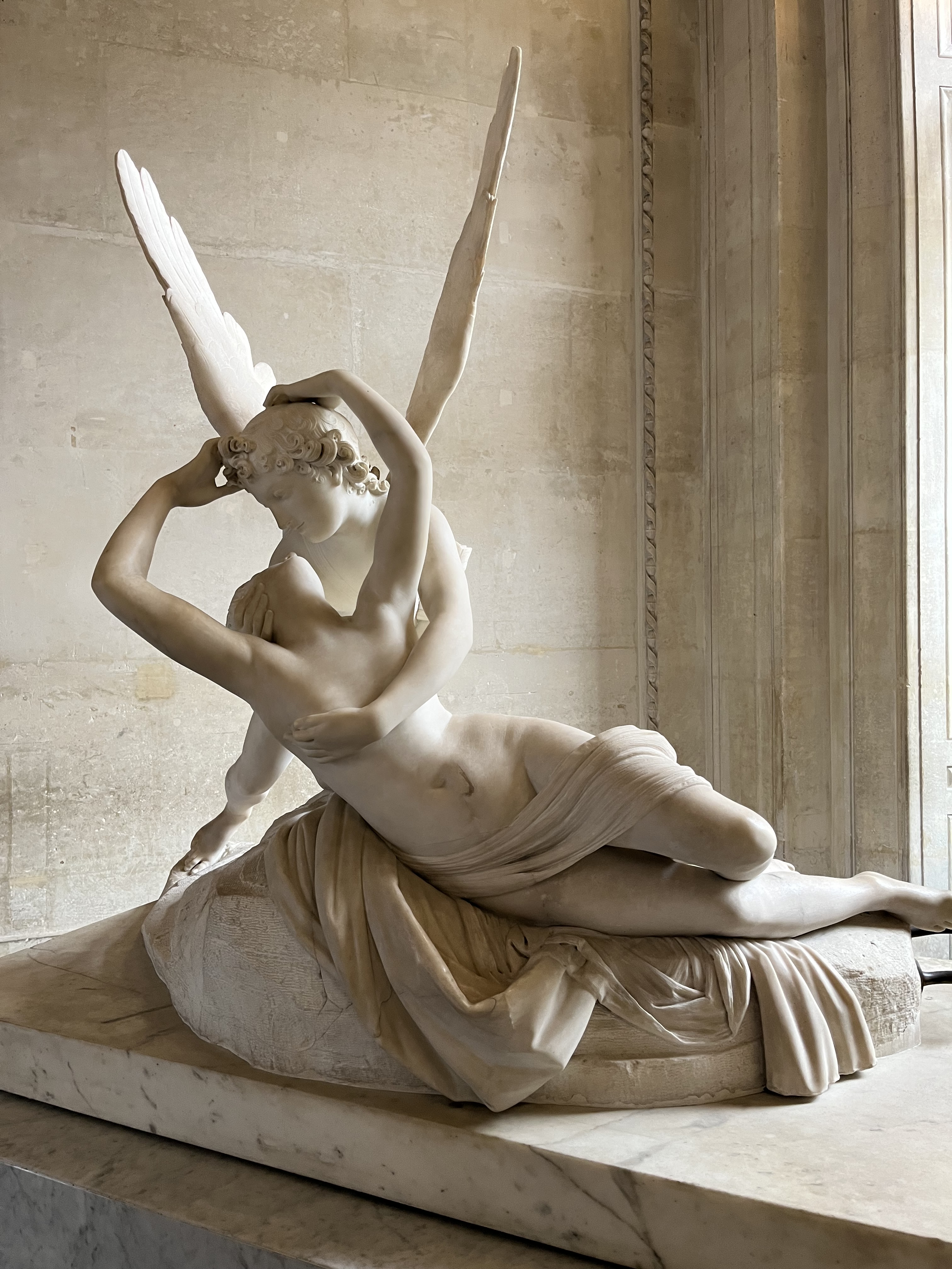 Quand la sculpture exalte le corps : ci-dessus à gauche Psyché ranimée par le baiser de l’Amour d’Antonio Canova, à droite le Mercure volant de Jean de Bologne.