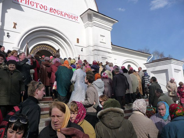Христос Воскресе! : le Christ est ressuscité, c’est ce que proclame la banderole fixée sur le portail de l’église où se presse la foule.