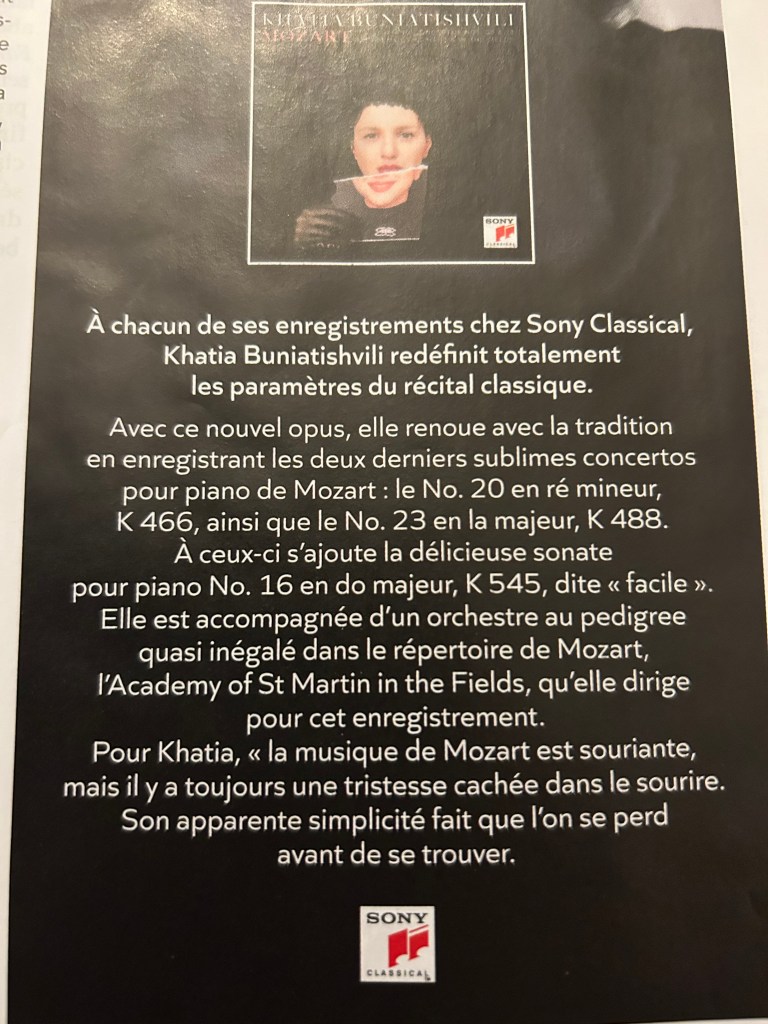 Elle n’est pas antipathique, mais elle n’est sans doute pas la plus grande pianiste du moment, même si elle bénéficie d’une intense campagne de promotion plutôt rare dans le domaine de la musique classique. Mais pourquoi l’exposer au ridicule et à la caricature ? Le texte qui est paru sur son dernier disque est navrant : n’y a-t-il plus personne dans les maisons de disques qui connaisse la musique et soit capable de relire et corriger cette piètre présentation truffée d’erreurs et d’approximations que même un non-mélomane repère immédiatement ?
